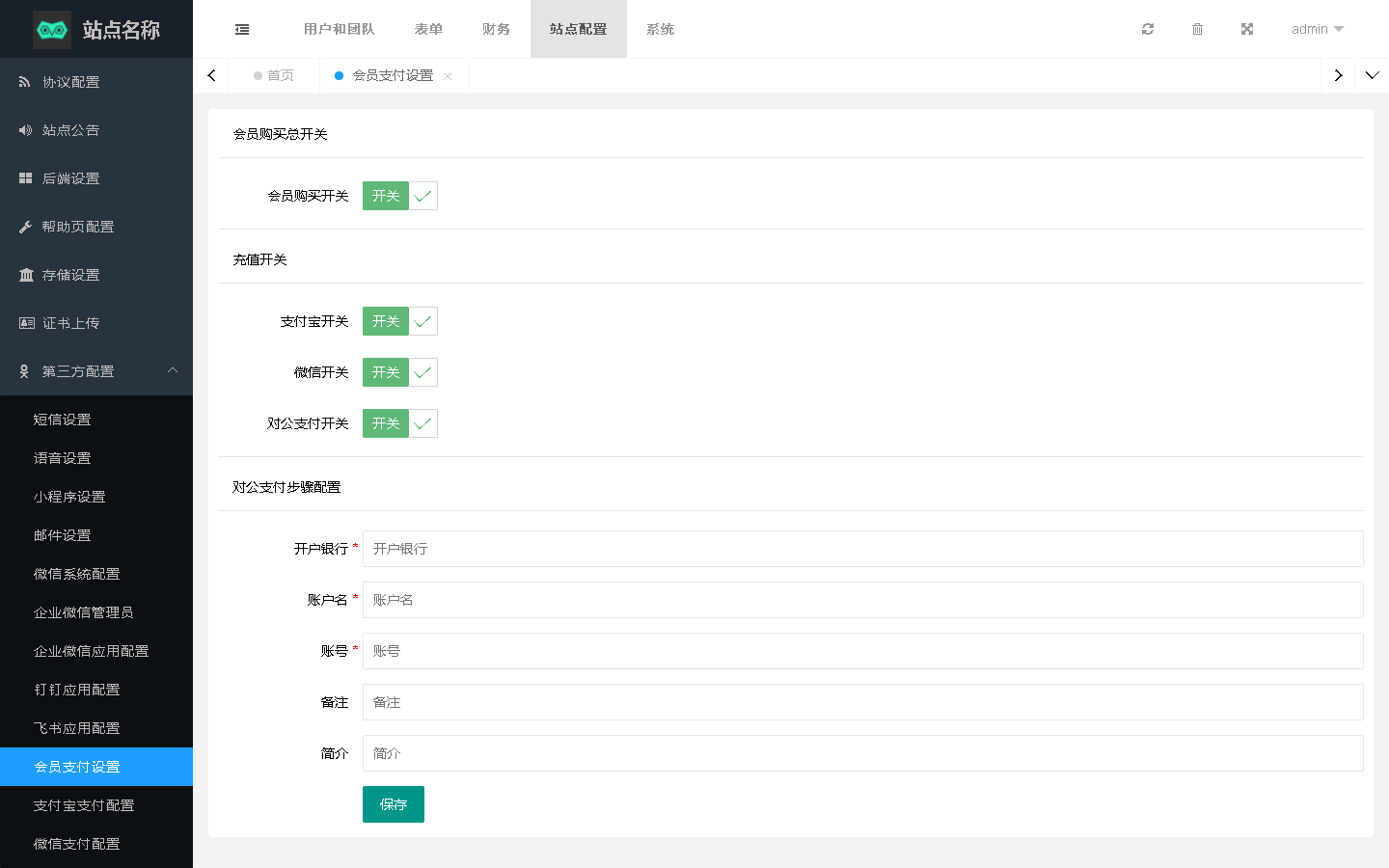 后台会员支付开关默认关闭,管理员可在后台手动开启。