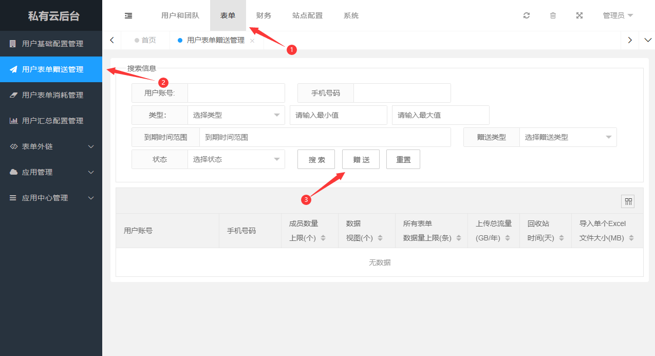1、登录私有云管理后台https://私有云域名/admin,选择表单->用户表单赠送管理->赠送