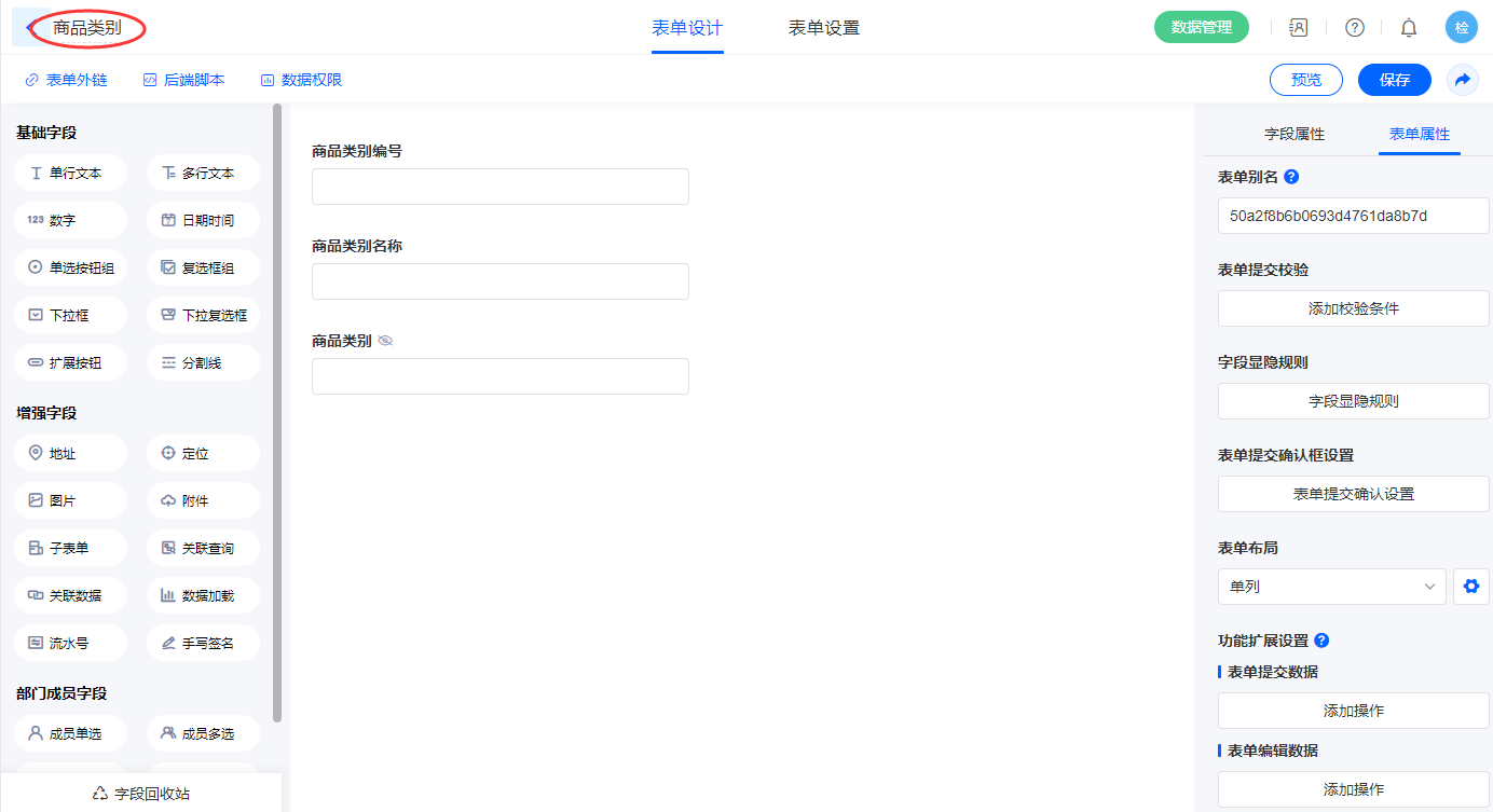 1)【商品类别】字段,选择设置为关联其他表单数据,关联商品类别的【商品类别】字段;