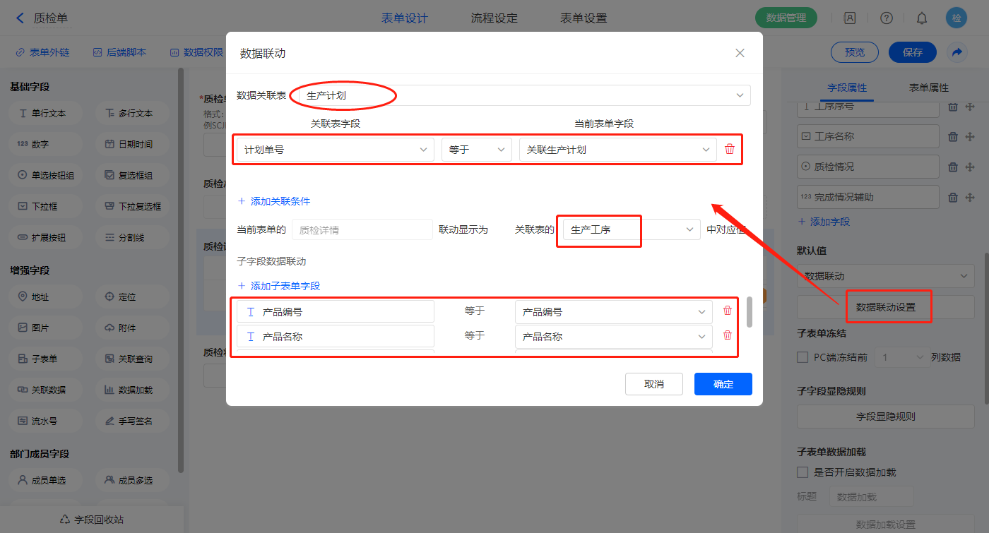 2)【质检详情】子表单字段,设置默认值为数据联动,设置联动条件及联动字段;