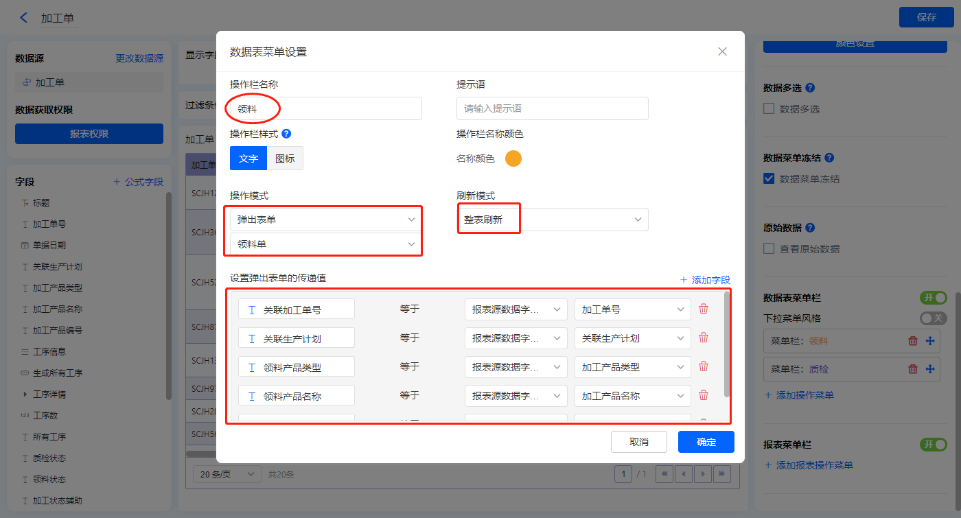 【领料】的菜单栏,操作模式设置为弹出表单【领料单】;