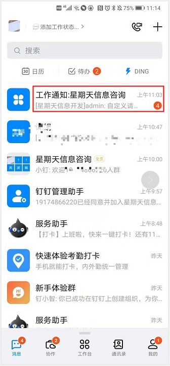 手机钉钉上收到推送消息的效果: