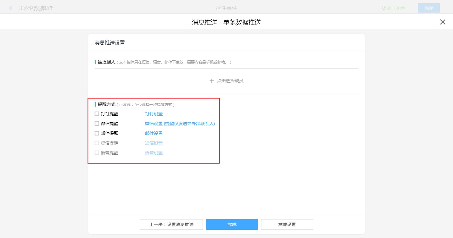 使用数据助手推送消息时,提醒的方式可以勾选钉钉、邮件、短信、语音、微信(提醒仅发送给外部联系人)。 数据助手-消息推送设计参考数据助手-消息推送。