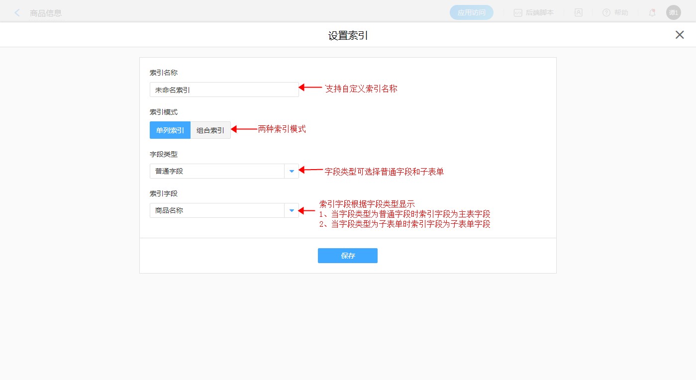 - 主表索引和子表单索引是分开设置的,即选择主表字段就不能选择子表字段,选择子表字段就只能选择本子表单内字段;
